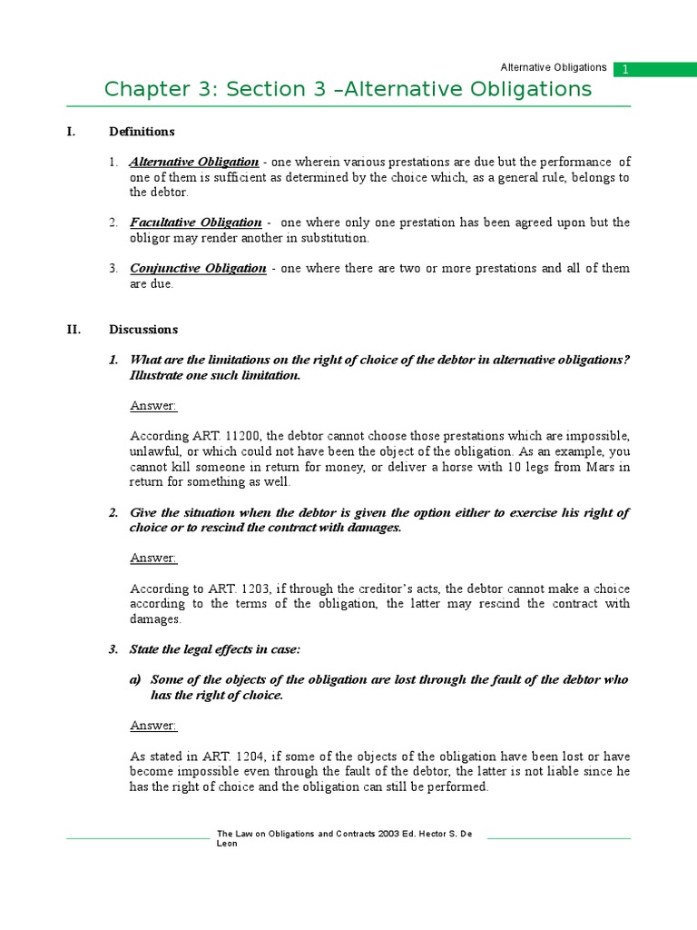 Alternative Obligations Q A Indemnity Damages from imgv2-2-f.scribdassets.com Thus, where kitty and baste promised in solidum to pay leni lowbredo p10,000.00, we have an example of a. What is the legal meaning of obligation? Obligation definition, something by which a person is bound or obliged to do certain things, and which arises out of a sense of duty or results from custom, law, etc. Something by which a person is bound or obliged to do certain things, and which arises out of a. For example, parents have a social obligation to teach children good manners. People who are under obligations may choose to freely act under obligations. Choose the correct option to complete the. Legal age to enter into contract has now been reduced to.